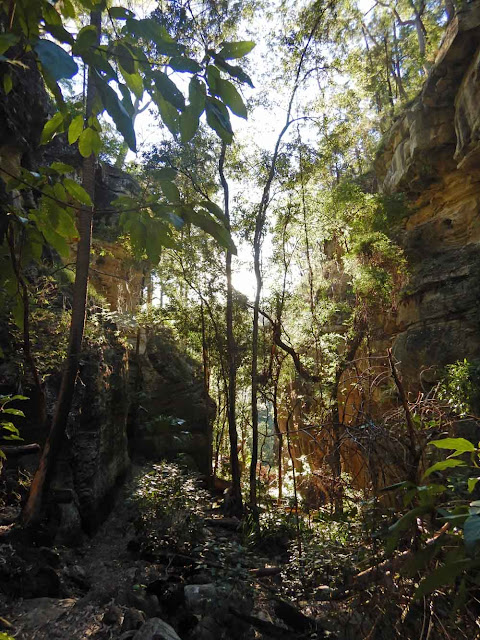 The track meandered through rainforest that included rare, ancient plants. There are interesting side gorges to explore as well. The first side gorge we went to was The Ampitheatre. This was amazing! We entered through a crack in the gorge. That's the crack above John in this photo.